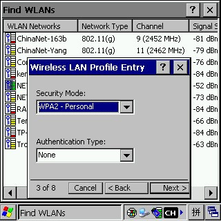 6、繼續點“Next”,出現“Security Mode”和“Authentication Type”的設置,這里需要注意的是,這兩個選項與具體的無線網絡設置有關,最好進入無線路由器的管理界面里弄清楚無線設置,一般Security Mode選“WPA2 - Personal”,Authentication Type選None: